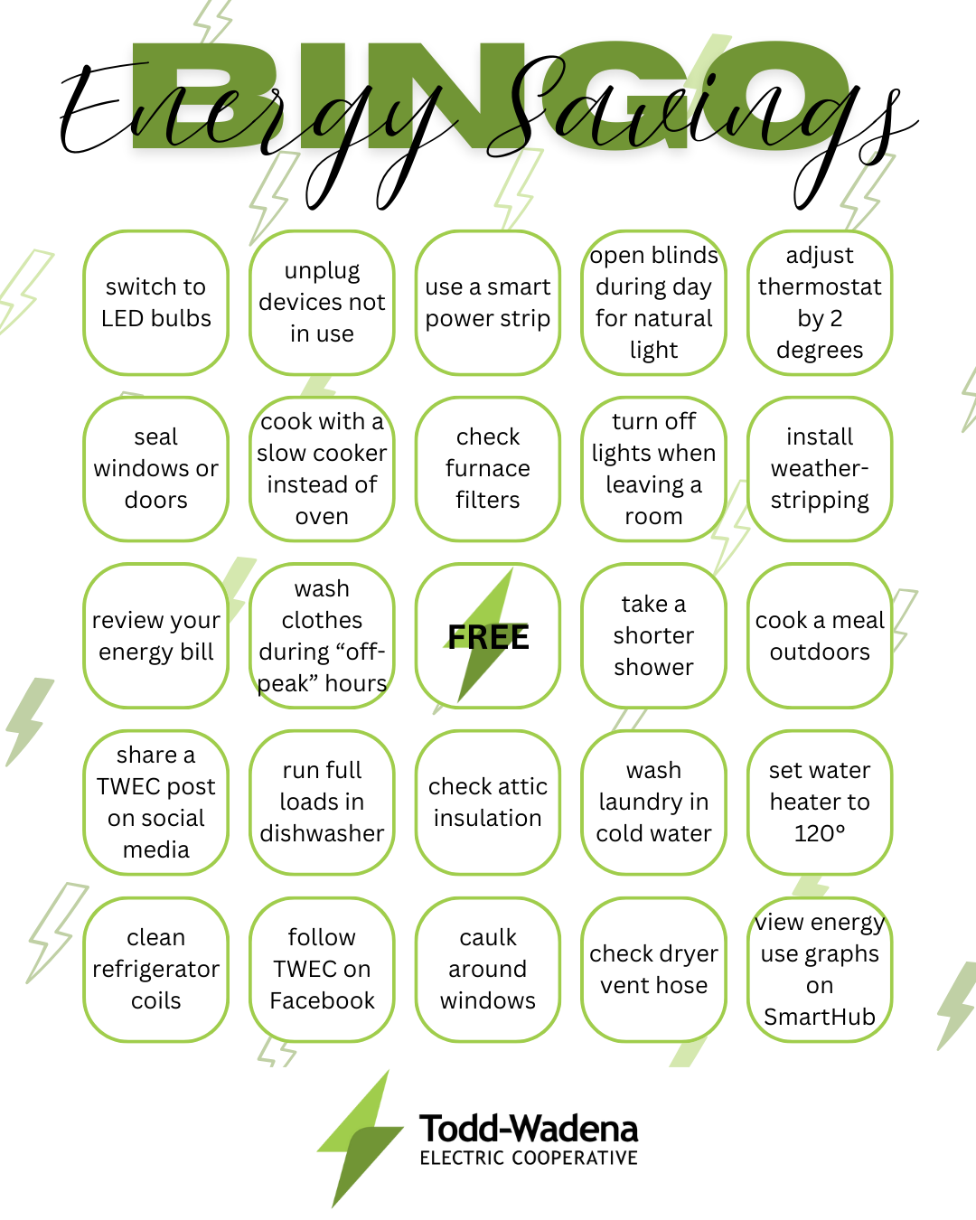 Energy Bingo is a simple game to help you conserve energy or learn more about your energy use. Each square on your bingo card represents an energy-saving action—like turning off unused lights, adjusting your thermostat, or using smart plugs. Complete five actions in a row (vertical, horizontal, or diagonal) to get Bingo!