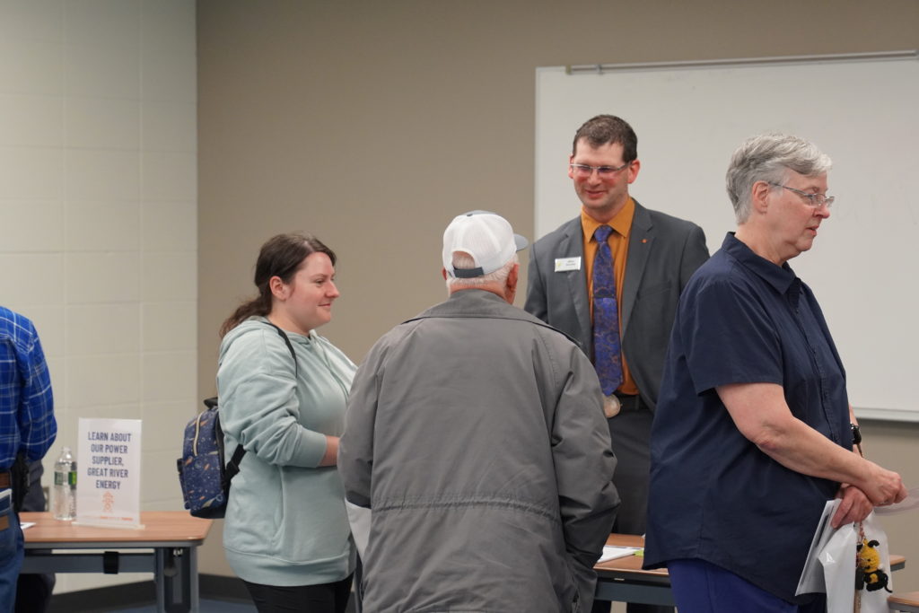 The business meeting began at 5:30 p.m. with an invocation from Pastor Nate Loer. Following a meal catered by Clarissa Ballroom, CEO Dan Carlisle shared insights from a recent Great River Energy meeting and introduced department highlight videos showcasing cooperative achievements.